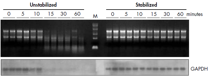 생체에서 biological sample을 분리하면, sample 내의 RNA는 극도로 불안정해집니다. RNA는 주변의 RNase에 의해 분해되며, 온도가 높거나 불안정 할수록 분해는 더욱 빠르게 진행됩니다. 또한 sample 자체의 manipulation으로 유전자의 발현 또는 억제가 발생하여, 이는 궁극적으로 target mRNA level의 증감에 영향을 미칠 수 있습니다. 그렇기 때문에 sample 내의 RNA를 즉시 안정화시켜 mRNA를 보호하는 작업은 정확한 유전자 발현 분석을 위하여 반드시 진행되어야 합니다.