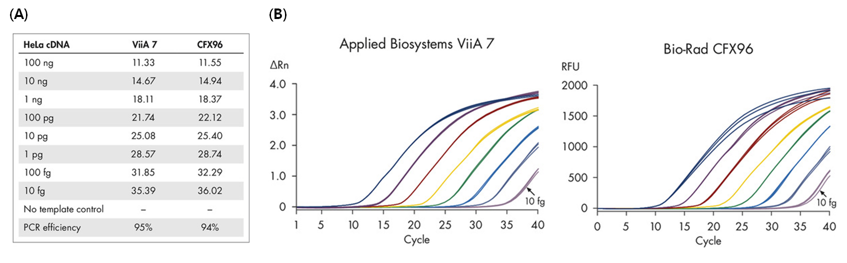 - ABI ViiA 7 과 Bio-Rad CFX96 장비를 이용하여 Hela cDNA를 10배 단위로 희석하여 beta-actin의 농도를 측정결과입니다. Quanti Nova SYBR Green PCR kit는 8단계로 희석하였을 때도 정확한 결과 확인할 수 있습니다.