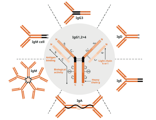 포유동물에서 항체는 Y units과 heavy chain의 유형에 기반하여 다섯 개의 isotypes 혹은 classes (IgG, IgM, IgA, IgD, IgE)로 분류될 수 있습니다. IgG, IgM, IgA, IgD와 IgE의 heavy chain는 각각 감마, 뮤, 알파 델타와 엡실론으로 알려져 있습니다. Isotype은 하단 표에서 명시하듯이 생물학적 특징, 기능적 위치, 서로 다른 항원을 다루는 기능이 다릅니다.